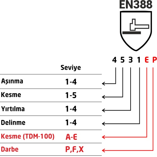* Kesme direnci 1-5, diğer fiziksel performans faktörleri ise 1-4 üzerinden derecelendirilir. 2016’da ise yeni kesme direnci A-F (F en yüksek direnç) ve yeni darbe koruması seviyeleri X (test edilmedi)- F (geçemedi)- P (geçti) eklenmiştir.